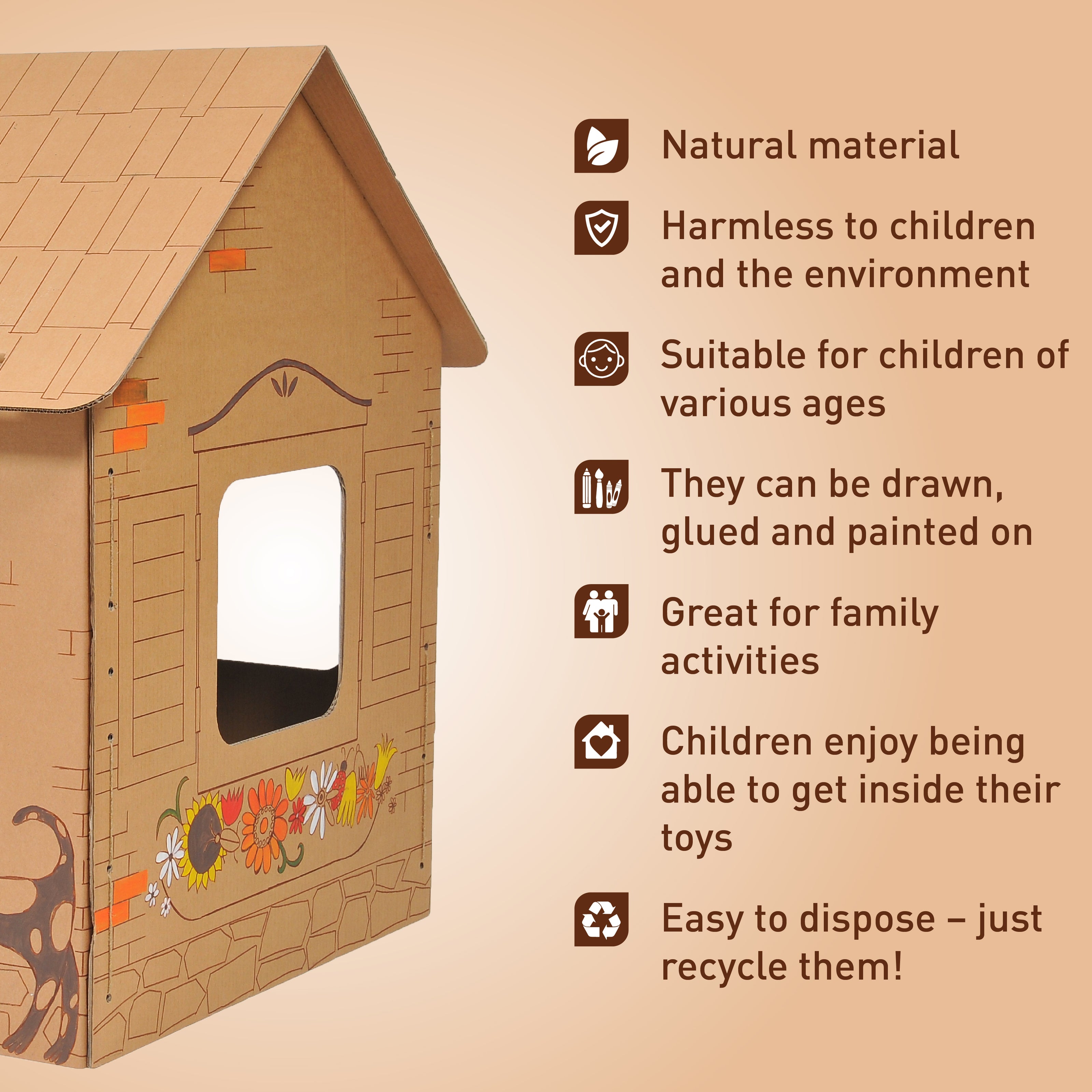 Stundenlanges Spielen mit den Eltern, Spielsicherheit, das Papphaus ohne schädliche Bestandteile, ein Öko-Haus, vollständig biologisch abbaubar, begrenzen den Einsatz von Plastik und sichern mit dem Kind die Zukunft unseres Planeten.
