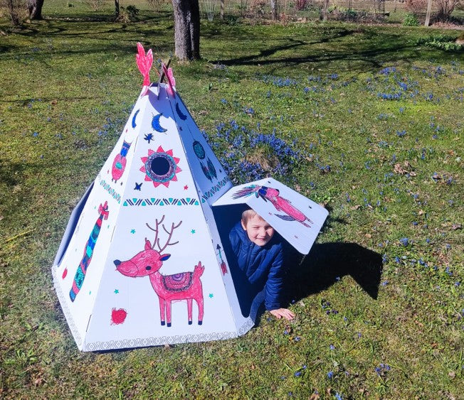 Kartona spēļu mājiņu Vigvams -Telts ir viegli uzbūvēt - tās sienas tiek sastiprinātas ar klipšu palīdzību.